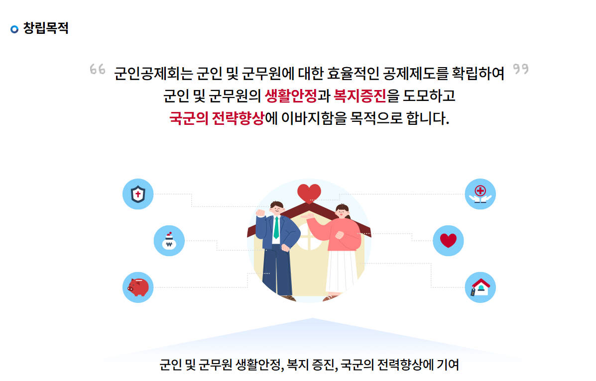 군인공제회(MMAA)는 군인과 군무원의 재정적 안정과 복지 증진을 목표로 설립된 조직입니다. 군복무라는 특수한 직업 환경 속에서 군인과 군무원이 직면하는 경제적 어려움과 장기적 재정 계획의 필요성을 충족시키기 위해 저축, 대여, 연금 및 다양한 복지 혜택을 제공하며, 이러한 서비스를 통해 군인의 삶의 질을 향상시키고 있습니다.