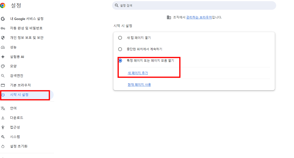- 좌측 메뉴에서 "시작 시 설정"을 선택합니다.