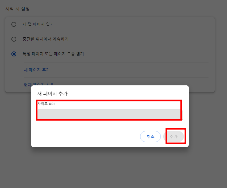 - "시작 그룹"에서 "특정 페이지 열기"를 선택합니다.