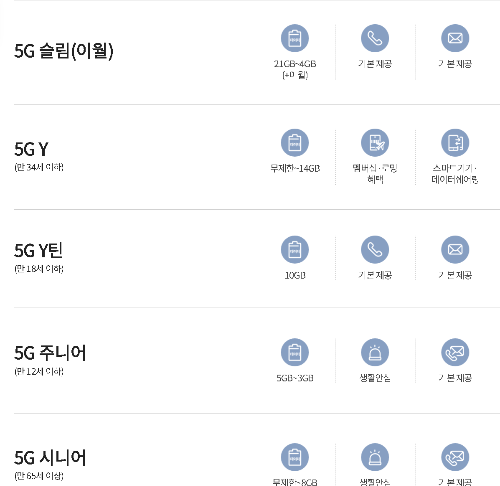 - 무제한 사용자 (월 150GB 이상): 5G 초이스/스페셜/베이직